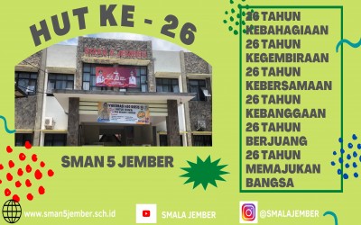 Selamat ulang tahun untuk SMAN 5 Jember Semoga dengan bertambahnya usia, sekolah ini makin banyak mencetak generasi unggul bagi bangsa. Generasi yang