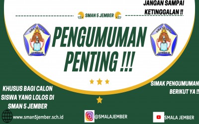 PENGUMUMAN BAGI CALON SISWA YANG SUDAH DI TERIMA DI SMAN 5 JEMBER SILAHKAN KONFIRMASI BAHWA ANDA SUDAH LULUS DAN LOLOS DI SMAN 5 JEMBER. JIKA SELESAI