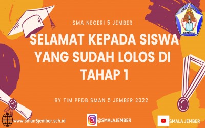 HALO CALON SISWA SMA NEGERI 5 JEMBER. APAKAH KAMU TERMASUK DALAM SISWA YANG LOLOS DALAM TAHAP 1 DI SMA NEGERI 5 JEMBER? SILAHKAN CEK NAMA KAMU DI TAB