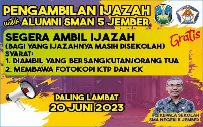 PENGAMBILAN IJAZAH BAGI ALUMNI SMAN 5 JEMBER SECARA GRATIS.. SILAHHKAN BAGI ALUMNI SMAN 5 JEMBER YANG BELUM MENGAMBIL IJAZAH BISA SEGERA MENGAMBIL KE