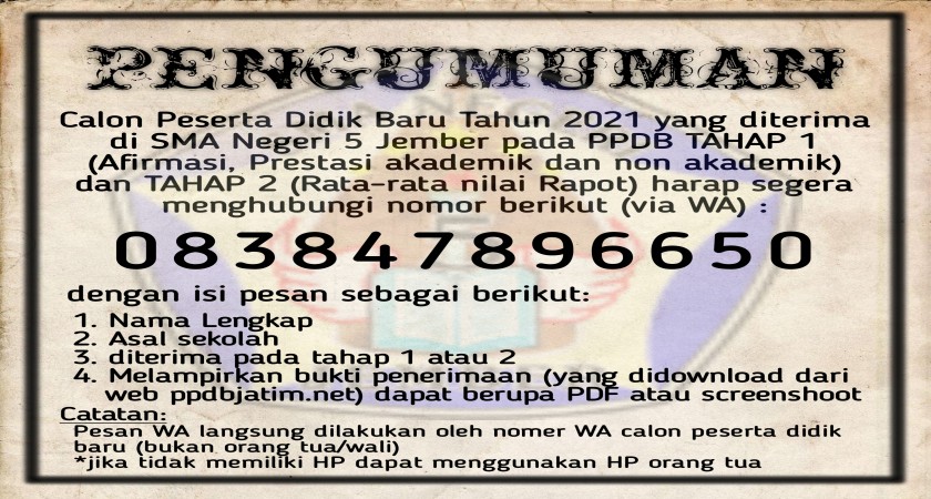 PENGUMUMAN TERSEBUT DITUJUKAN KEPADA SISWA DAN SISWI YANG SUDAH LOLOS DAN DI TERIMA DI SEKOLAH SMAN 5 JEMBER.