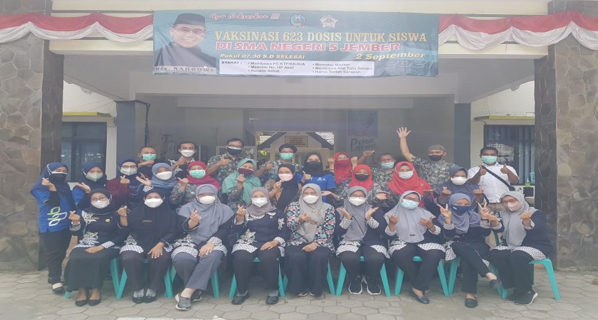 Dengan di bantu oleh tim satgas Covid Jember dan tim dari Puskesmas Panti Jember, SMAN 5 Jember mengadakan kegiatan Vaksinasi 623 dosis untuk siswa yang diadakan di SMAN 5 Jember pada tanggal 2 September 2021. Target dan tujuan kami adalah untuk melakukan Vaksin Pertama bagi siswa siswi dan warga SMAN 5 Jember yang belum berkesempatan untuk mendapatkan Vaksin Pertama sebelumnya. Berikut adalah lampiran beberapa foto pada saat kegiatan dan vidio pada saat Vaksinasi di lakukan.