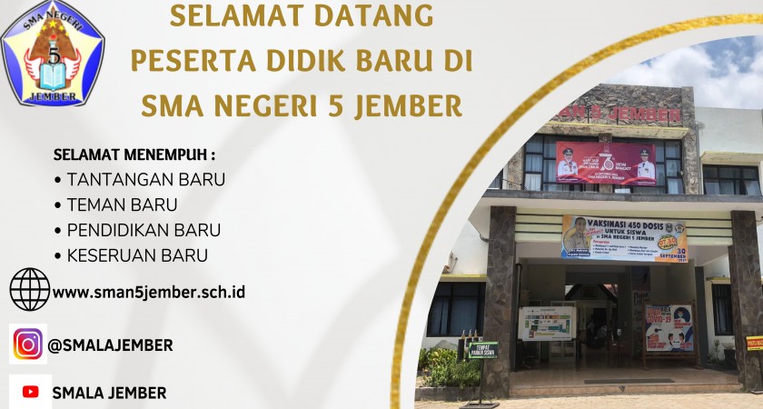 SELAMAT DATANG BAGI SISWA BARU YANG SUDAH LOLOS KE SMA NEGERI 5 JEMBER YANG KITA CINTAI INI. KAMI BERHARAP SUPAYA SISWA-SISWA BARU INI BISA MENJADI PENERUS BANGSA YANG DAPAT DI ANDALKAN CERDAS SERTA BERDEDIKASI TINGGI DALAM BIDANG PENDIDIKAN. TAK LUPUT JUGA KITA BERHARAP AGAR KITA SEMUA SELALU SEHAT DALAM KEADAAN APAPUN. SELAMAT MENEMPUH PEMBELAJARAN BARU, PERJALANAN BARU, TANTANGAN BARU, KEGIATAN BARU, TEMAN BARU, DAN KESENANGAN BARU DI SEKOLAH KITA YAITU SMA NEGERI 5 JEMBER.