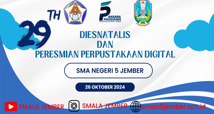 Tepat pada tanggal 26 Oktober 2024 SMAN 5 Jember berusia 29 tahun. Dimana umur yang sudah tidak muda dan tidak terlalu tua. Sudah banyak yang di lalui dalam 29 Tahun ini. Banyak perjuangan juga yang sudah dilakukan oleh SMALA dalam memajukan dan membangun generasi muda Negera Indonesia. Dan semoga dalam peringatan ke 29 tahun ini kita semua masih diberi kekuatan agar terus dapat menjadikan generasi muda kita memiliki ahlak yang baik dan pengetahuan yang luas.