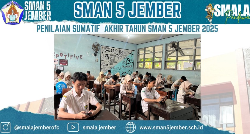 HARI INI PADA TANGGAL 25 MEI TAHUN 2025 DI MULAI PENILAIAN SUMATIF AKHIR TAHUN BAGI KELAS X DAN KELAS XI DI SMAN 5 JEMBER. UJIAN BERLANGSUNG SELAMA 6 HARI DAN BERAKIR PADA HARI RABU 4 JUNI 2025. UJIAN DI LAKUKAN DENGAN BERBASIS KOMPUTER/DIGITAL MENGGUNAKAN HANDPHONE SISWA MASING2 MENGGUNAKAN JARINGAN LOKAL SEKOLAH. GURU TETAP MENGAWASI SISWA SUPAYA UJIAN BERJALAN DENGAN LANCAR.