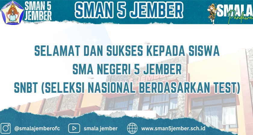 Pada hari Rabu tanggal 28 Mei 2025 lalu adalah saat di mana pengumuman lolos SNBT (Seleksi Nasional Berdasarkan Test) tahun 2025. Ada 47 siswa SMA Negeri 5 Jember yang terdata lolos dalam SNBT. Mayoritas diterima di kampus Jember dan beberapa ada yang lolos di Kota Malang dan Surabaya. Berikut adalah keterangan Kampusnya dan jumlah siswa yang lolos :