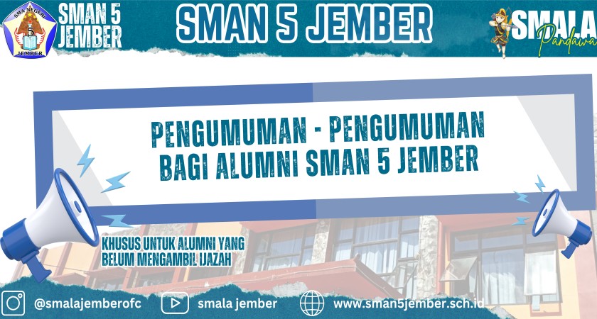 PEMBERITAHUAN BAGI KAKAK-KAKAK ALUMNI SMAN 5 JEMBER YANG BELUM MENGAMBIL IJAZAH. IJAZAH BISA DI AMBIL DI SEKOLAH SECARA GRATIS. IJAZAH BISA DI AMBIL PADA HARI SENIN - JUM'AT DI JAM KERJA (07.00-15.00 WIB) DI RUANGAN TATA USAHA.